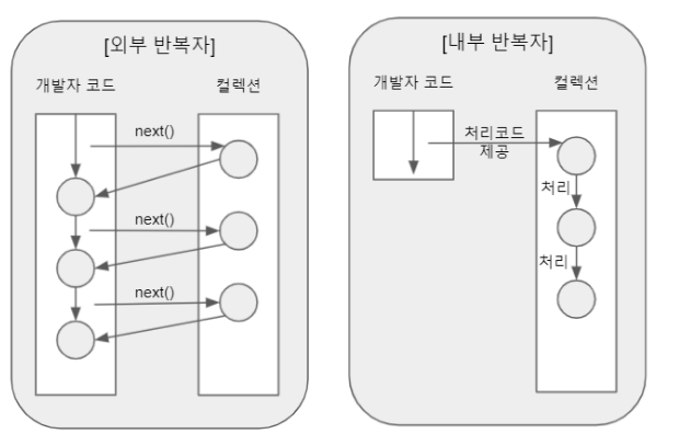 ๋ด๋ถ๋ฐ๋ณต์ : ์ปฌ๋ ์ ๋ด๋ถ์์ ์์๋ค์ ๋ฐ๋ณต์ํค๊ณ , ๊ฐ๋ฐ์๋ ์์๋น ์ฒ๋ฆฌํ ์ฝ๋๋ง ์ ๊ณตํ๋ ํจํด