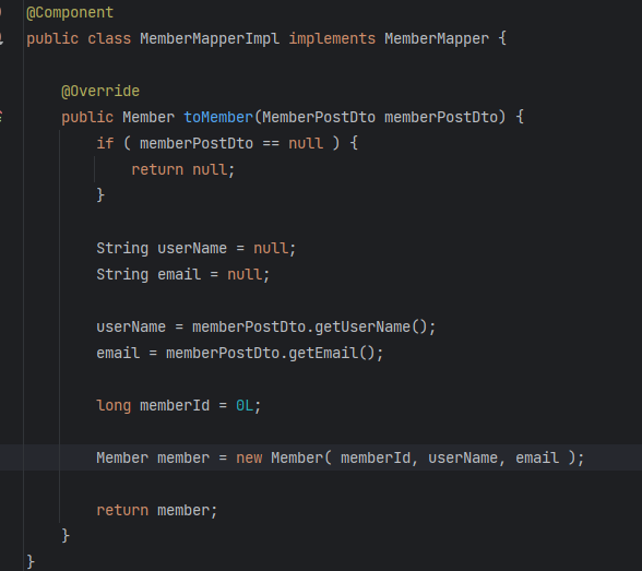 ์ด๋ฐ์์ผ๋ก userName๊ณผ email์ ์์ชฝ์์ ์ฐพ์์์ ์์์ ๋งคํ์ ํด์ค์ผ ๋๋๋ฐ ์ ๋ง ์ด์ํ๊ฒ๋ Member์ ๋ํดํธ ์์ฑ์๊ฐ ์๋๋ฐ๋ new Member(); ์ด๋ฐ์์ผ๋ก meber๋ฅผ ๋ฆฌํดํด์คฌ๋ค.