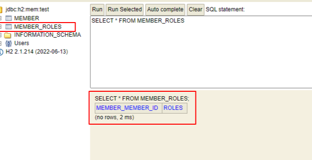 ์ด๋ฅผ DB์์ ์กฐํํ๊ฒ ๋๋ฉด, ์๋ ๊ทธ๋ฆผ๊ณผ ๊ฐ์ด Member ์ํฐํฐ ํด๋์ค์ ์ฐ๊ด๊ด๊ณ ๋งคํ์ ๋ํ ํ ์ด๋ธ์ด ์์ฑ๋๋ค.