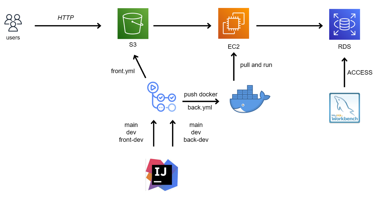- ์คํ๋๋ JAR ํ์ผ์ Docker ์์์ ๋์ํ๋ฉฐ ์ค์ ๊ฐ๋๋ก ์ง์ ๋ RDS๋ฅผ DB๋ก ์ฌ์ฉํ ๊ฒ์ด๋ค.